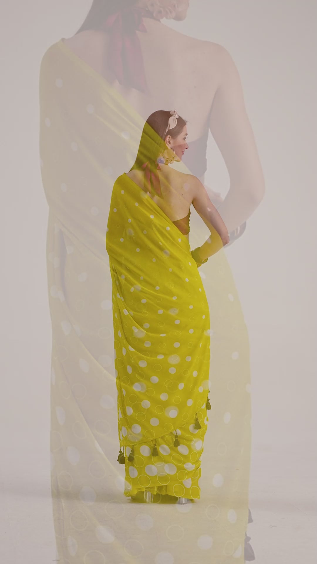 - Splashed with vibrant polka dot prints, this saree is made for statement-makers who love bold yet breezy fashion.