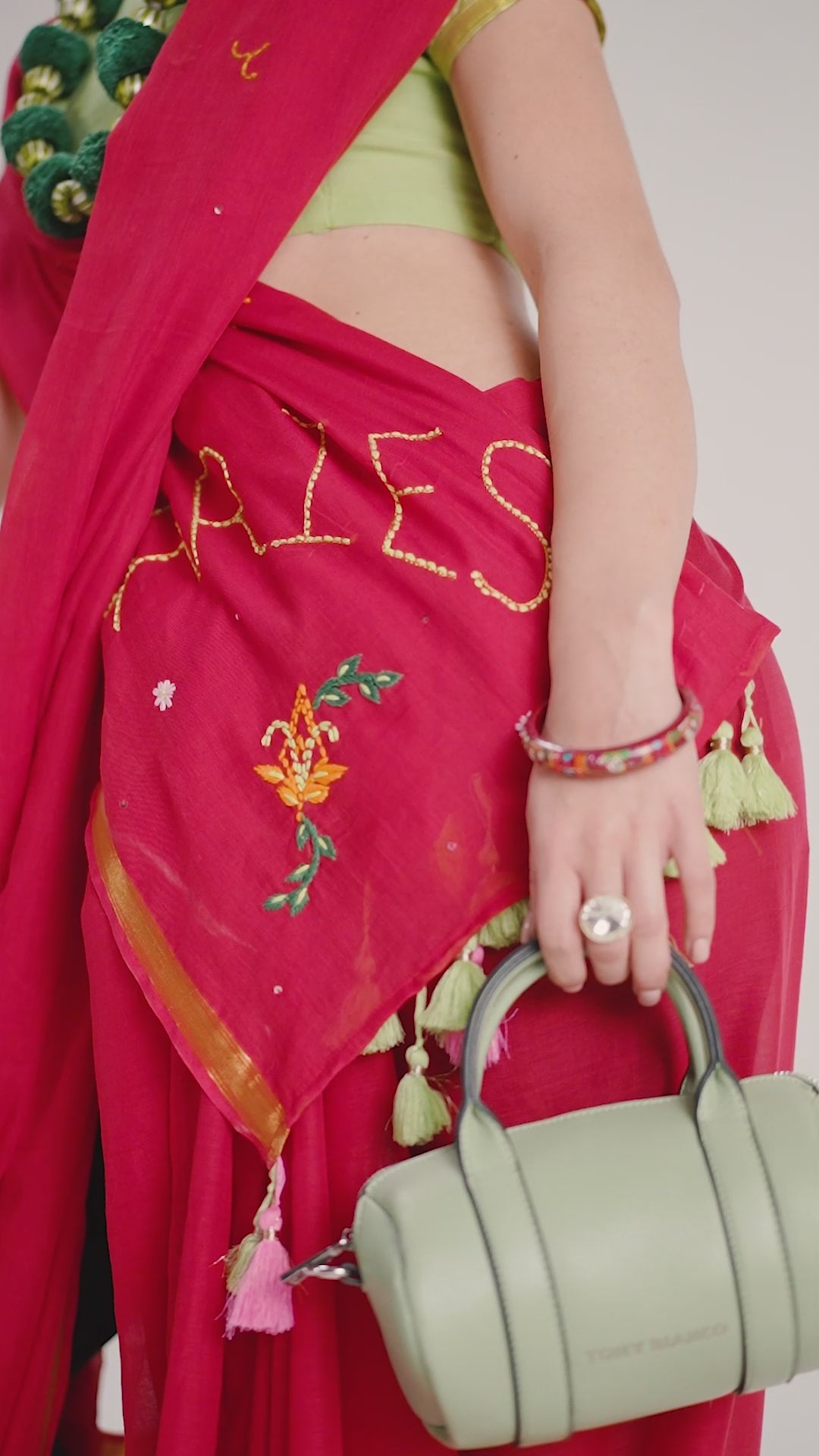 - The Viscose Mul Aries Sign Hand Embroidered Saree is a beautifully crafted piece that blends elegance with personalized charm.